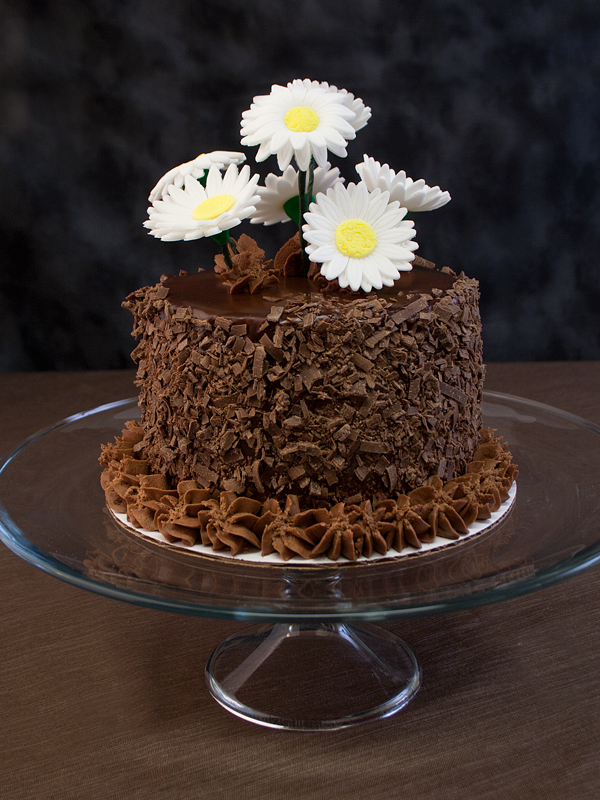 Chocolate, chocolate chip cake is brushed with coffee brandy liqueur, filled with opera cream frosting and bathed in chocolate ganache and shaved chocolate. Image