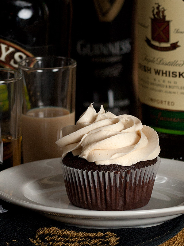 You know a cupcake is going to be good when the first ingredient is a cup of Guinness Stout. A chocolate Guinness cupcake with Jameson's dark chocolate ganache filling and topped with Bailey's Irish Cream buttercream frosting. Slainte!